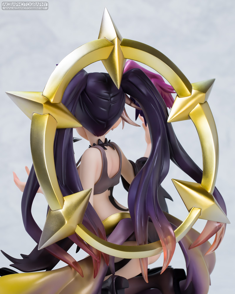 | 背中の金の環も固定されて梱包されているので組み立て等の必要はなし。 本体のボリュームが豊かに見え、環自体の塗装も質感高い。 そしてそこに絡まる髪の毛はクリアパーツで美しく仕上げられているので、正面の情報量に負けず劣らず背中からの眺めも豪華です。 |